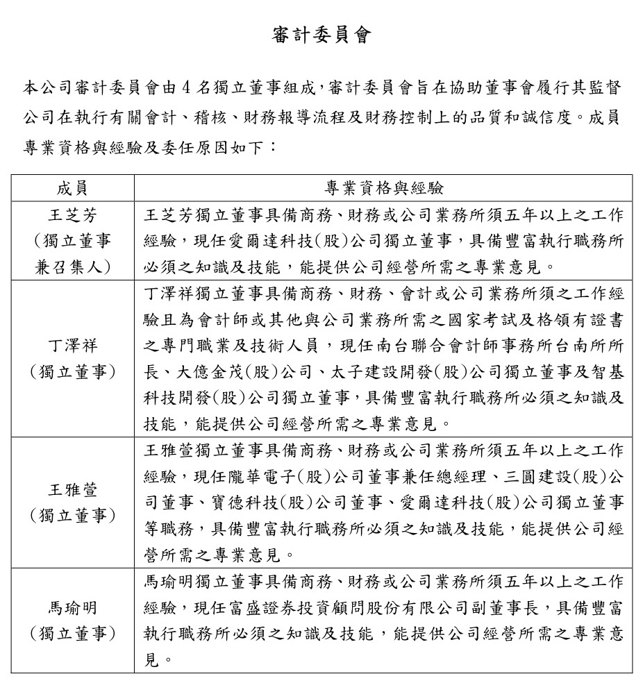 為強化健全董事會監督及管理機制,本公司於民國105年8月設置審計委員會。本委員會由全體獨立董事組成,其人數不得少於三人,其中一人為召集人,且至少一人應具備會計或財務專長。本委員會獨立董事之任期為三年,連選得連任。本委員會之召集人對外代表本委員會。