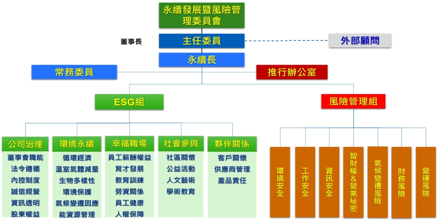 「永續發展暨風險管理委員會」擔任上下整合、橫向串聯的跨部門溝通平台。經由每季會議及依議題而設的公司治理小組、環境永續小組、幸福職場小組、
